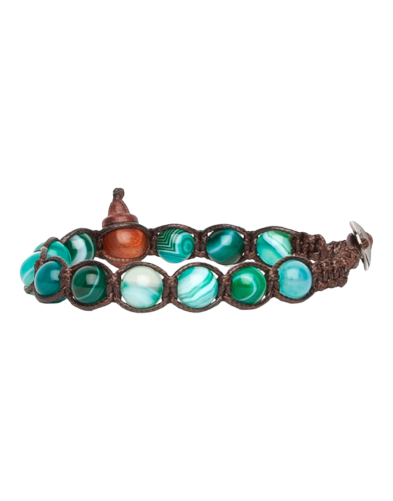 Bracciale unisex originale Tibetano Tamashii® realizzato con pietra naturale Agata verde persia striato e cordoncino marrone.