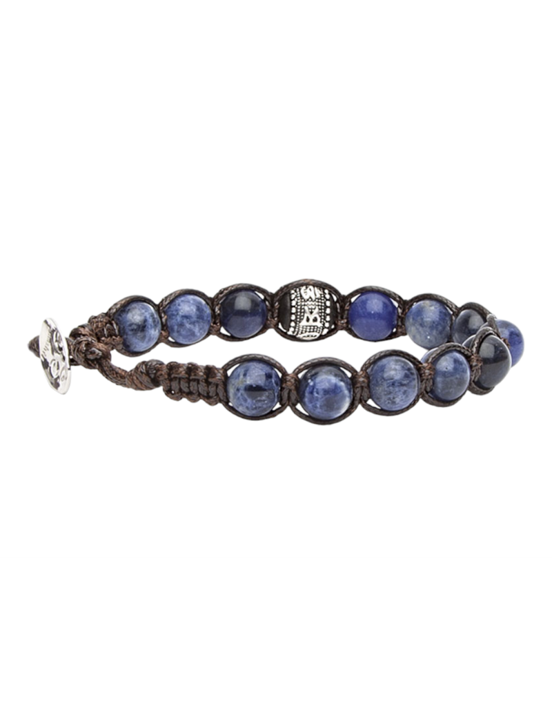 Bracciale unisex originale Tibetano Tamashii® della linea Ruota della Preghiera realizzato con pietre naturali di Sodalite e cordoncino marrone.