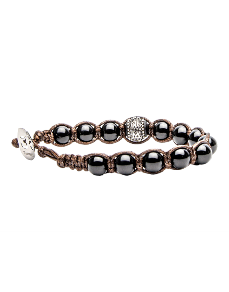 Bracciale unisex originale Tibetano Tamashii® della linea Ruota della Preghiera realizzato con pietre naturali di Onice e cordoncino marrone.