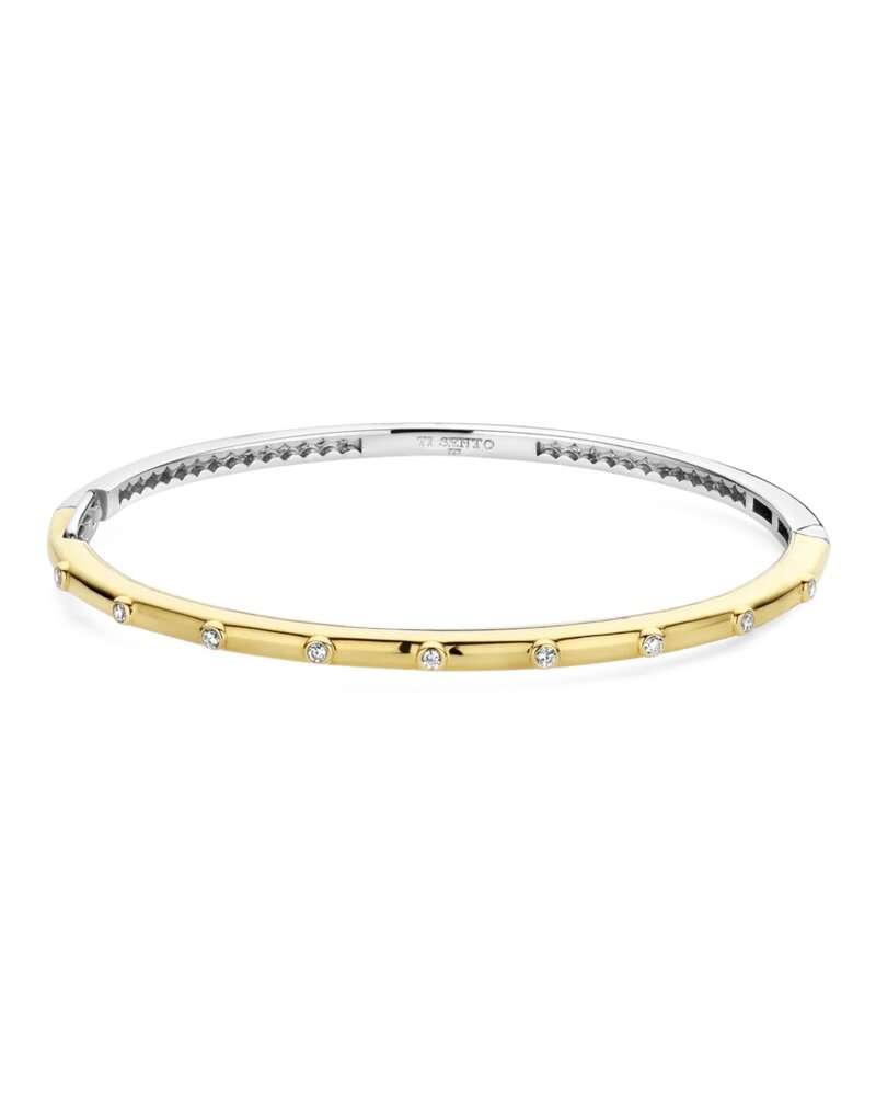 Bracciale rigido in argento 925 con galvanica in oro giallo, impreziosito da pietre di zirconia cubica, montate con cura a mano sulla fascia.