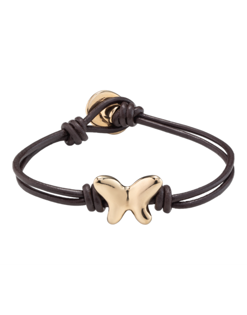 Questo bracciale è  formato da due strisce di pelle che sostengono una piccola farfalla centrale.