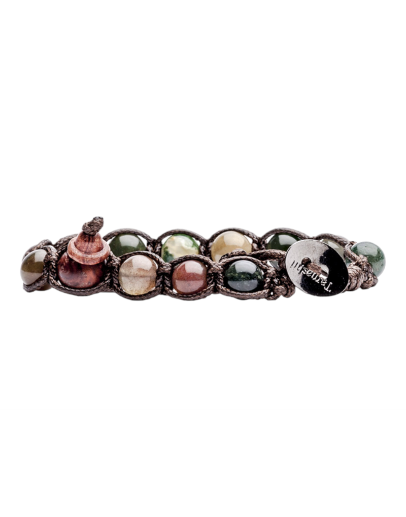 Bracciale unisex originale Tibetano Tamashii® realizzato con pietra naturale Agata muschiata e cordoncino marrone.