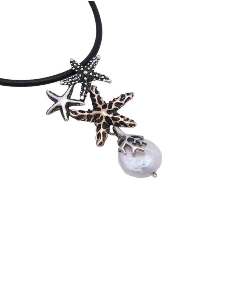 Collana composta da laccio in cuoio (44 cm) e ciondolo realizzato a mano in argento 925 e bronzo con perla naturale di fiume.