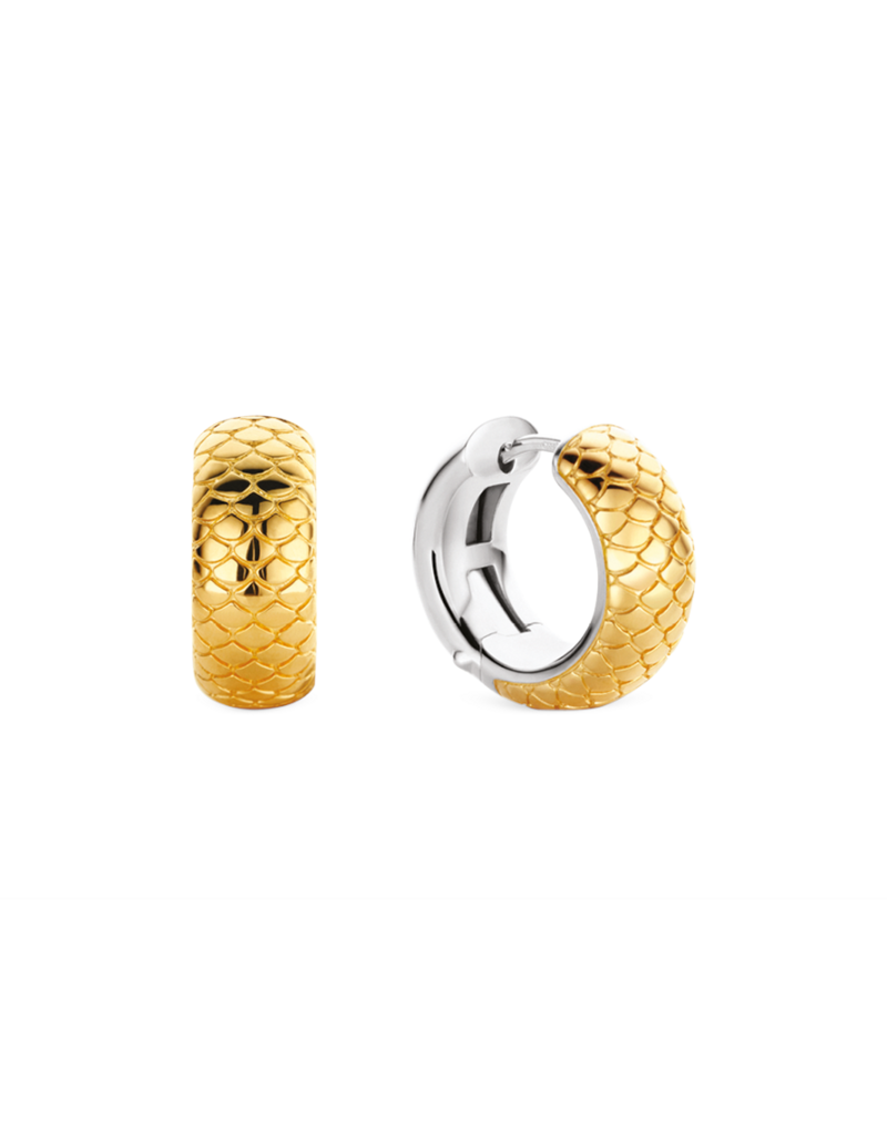Orecchini a cerchio realizzati in argento 925 e placcati in oro 18kt. Lavorati a pelle di