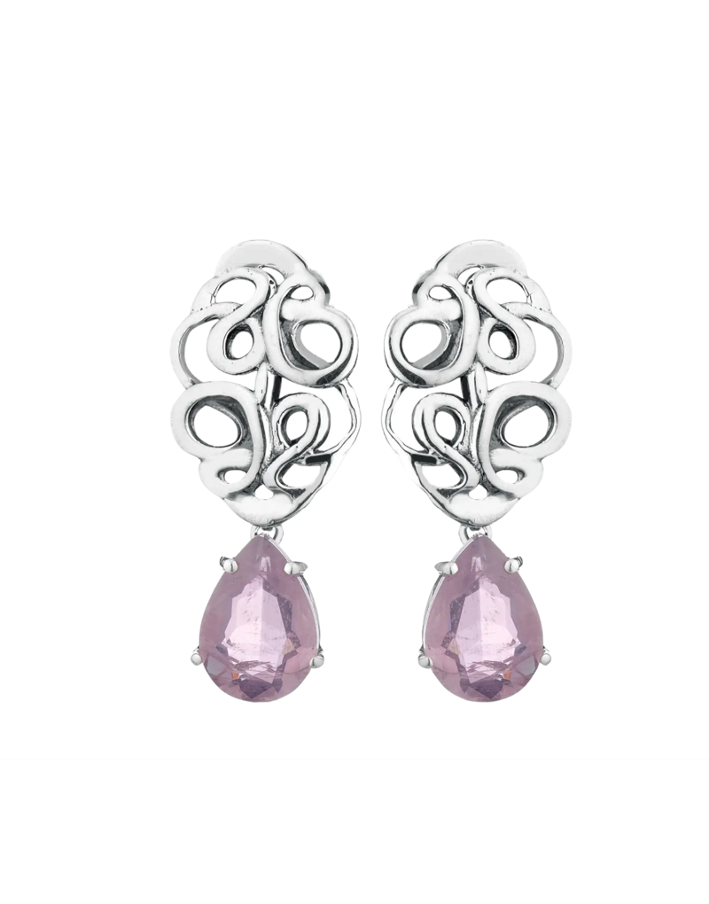 Orecchini lavorati in argento 925 con pendenti di quarzo rosa taglio goccia.