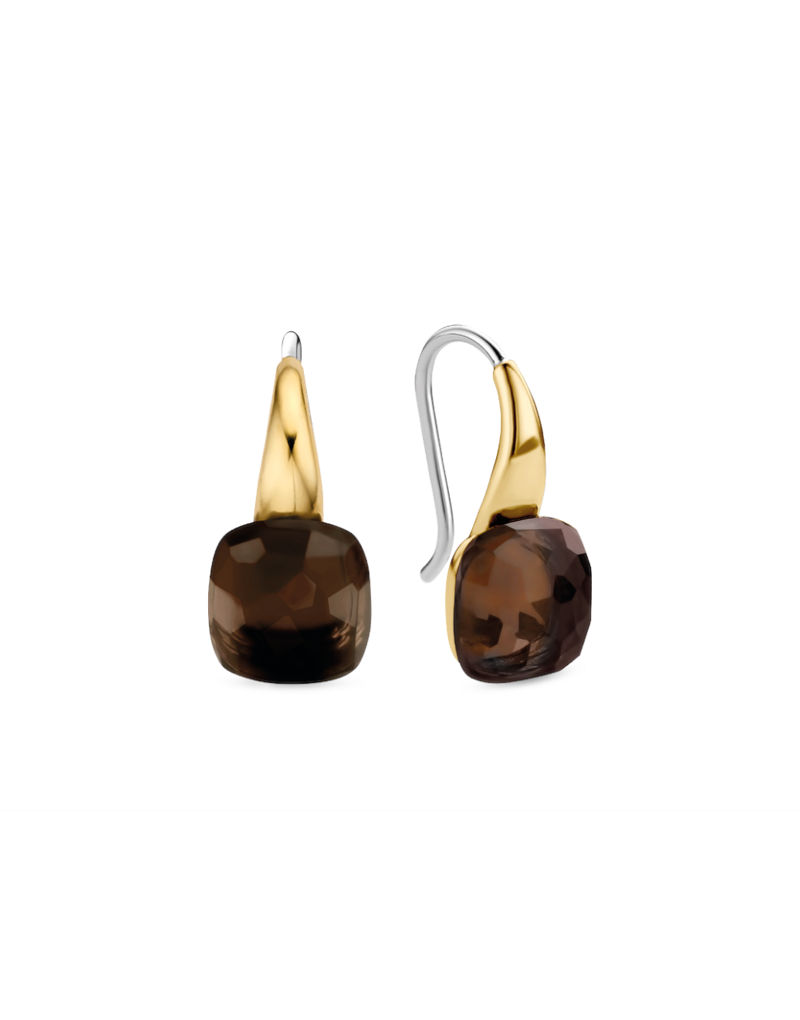 Le pietre color tortora di questi orecchini d'argento sono sfaccettate a mano. Hanno un originale taglio cuscino e sono incastonate in una montatura argento 925 placcata oro