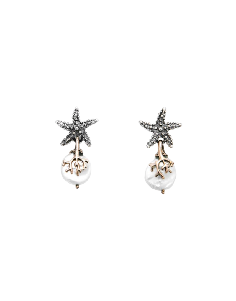 Orecchini con stelline in argento 925, dettagli in bronzo con perle naturali di fiume.